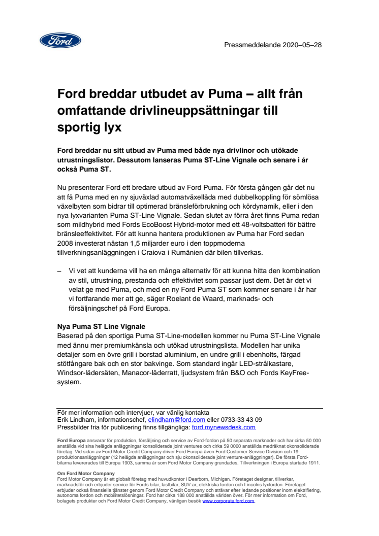 Ford breddar nu sitt utbud av Puma med både nya drivlinor och utökade utrustningslistor. Dessutom lanseras Puma ST-Line Vignale och senare i år också Puma ST.