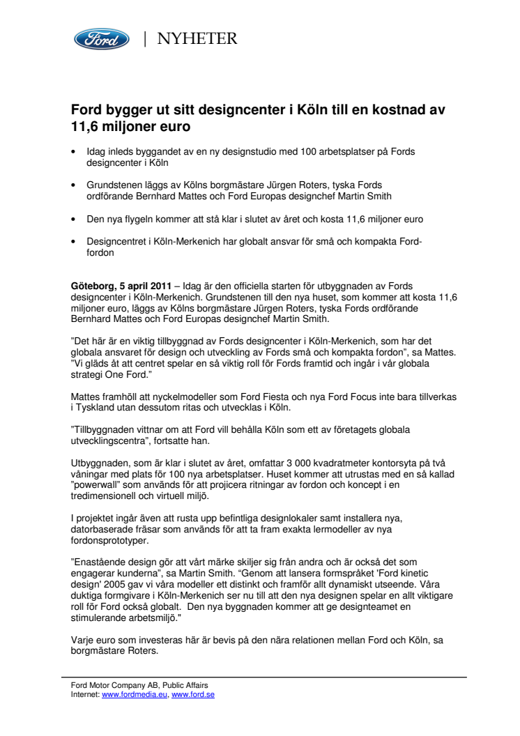 Idag är den officiella starten för utbyggnaden av Fords designcenter i Köln-Merkenich. Grundstenen till den nya huset, som kommer att kosta 11,6 miljoner euro, läggs av Kölns borgmästare Jürgen Roters, tyska Fords ordförande Bernhard Mattes och Ford Europas designchef Martin Smith.