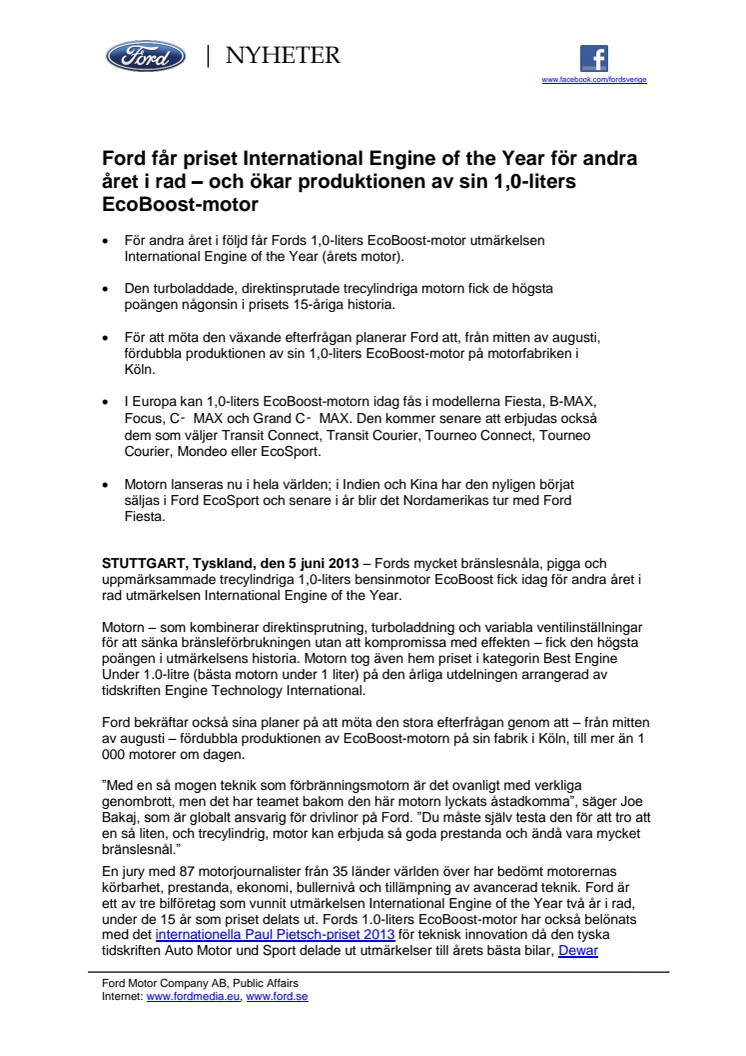 Ford får priset International Engine of the Year för andra året i rad – och ökar produktionen av sin 1,0-liters EcoBoost-motor