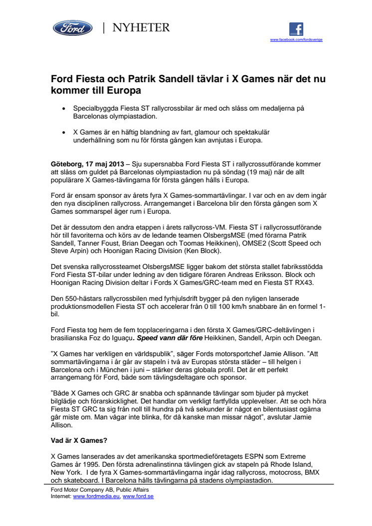 Sju supersnabba Ford Fiesta ST i rallycrossutförande kommer att slåss om guldet på Barcelonas olympiastadion nu på söndag (19 maj) när de allt populärare X Games-tävlingarna för första gången hålls i Europa. Bland toppförarna finns Patrik Sandell från Sverige.