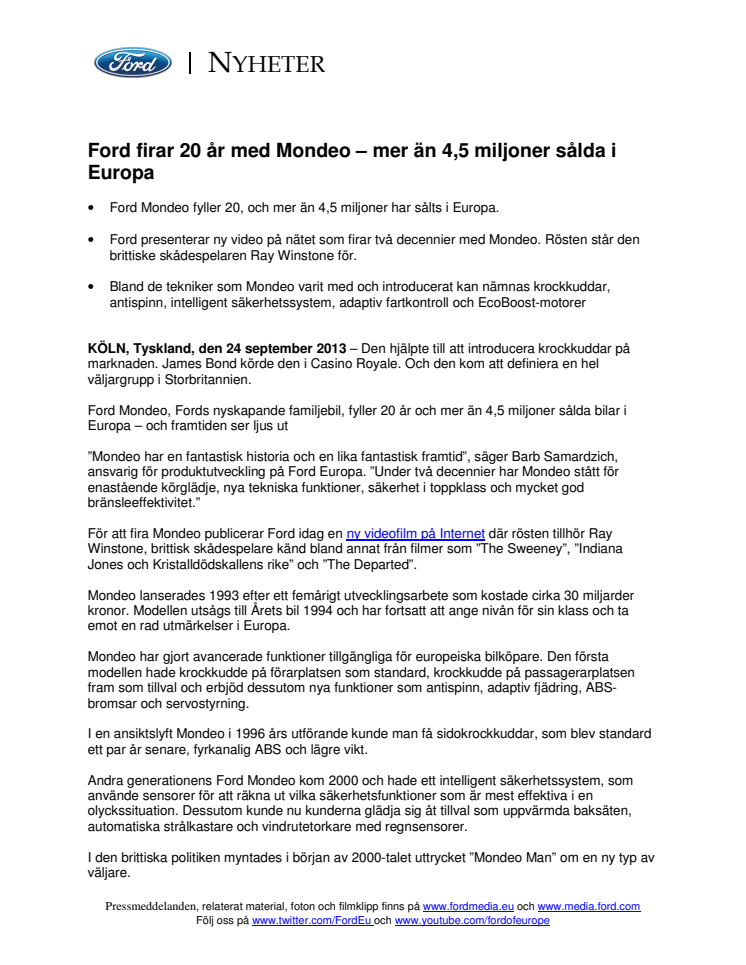 Ford Mondeo fyller 20, och mer än 4,5 miljoner har sålts i Europa, och Ford presenterar en video på nätet som firar två decennier med Mondeo.