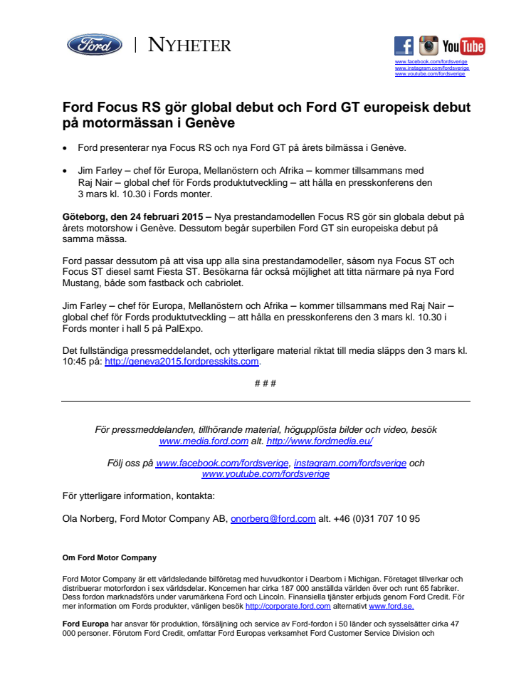 Nya prestandamodellen Focus RS gör sin globala debut på årets motorshow i Genève. Dessutom begår superbilen Ford GT sin europeiska debut på samma mässa.