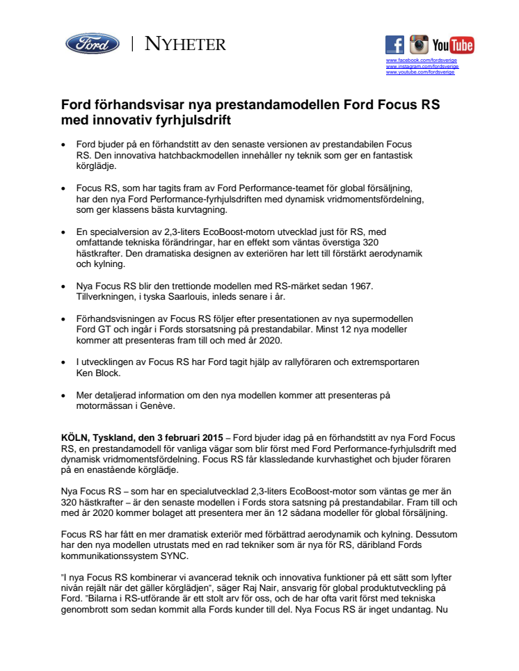 Ford förhandsvisar nya prestandamodellen Ford Focus RS med innovativ fyrhjulsdrift