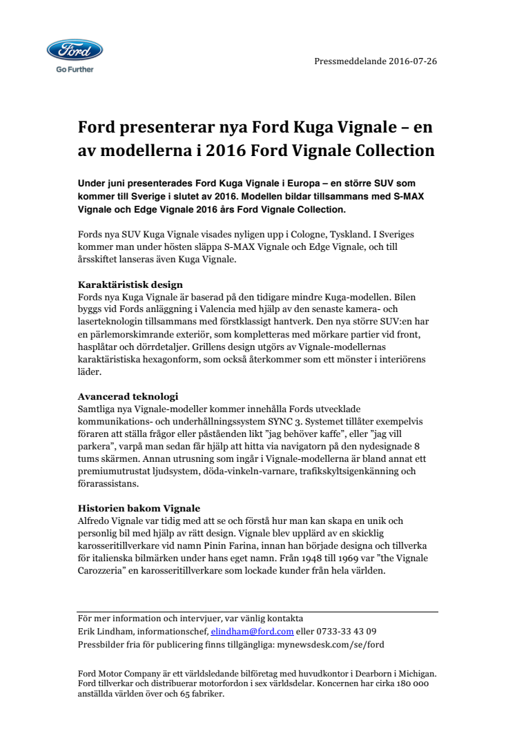 Under juni presenterades Ford Kuga Vignale i Europa – en större SUV som kommer till Sverige i slutet av 2016. Modellen bildar tillsammans med S-MAX Vignale och Edge Vignale 2016 års Ford Vignale Collection.