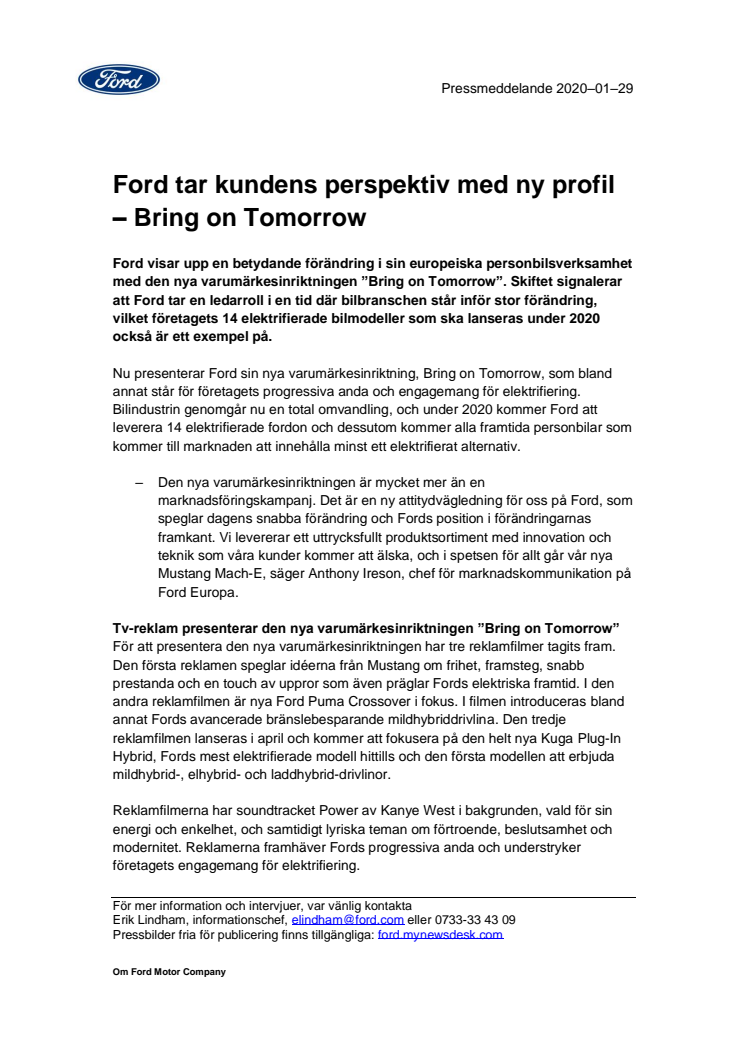Ford visar upp en betydande förändring i sin europeiska personbilsverksamhet med den nya varumärkesinriktningen ”Bring on Tomorrow”. Skiftet signalerar att Ford tar en ledarroll i en tid där bilbranschen står inför stor förändring, vilket företagets 14 elektrifierade bilmodeller som ska lanseras under 2020 också är ett exempel på.