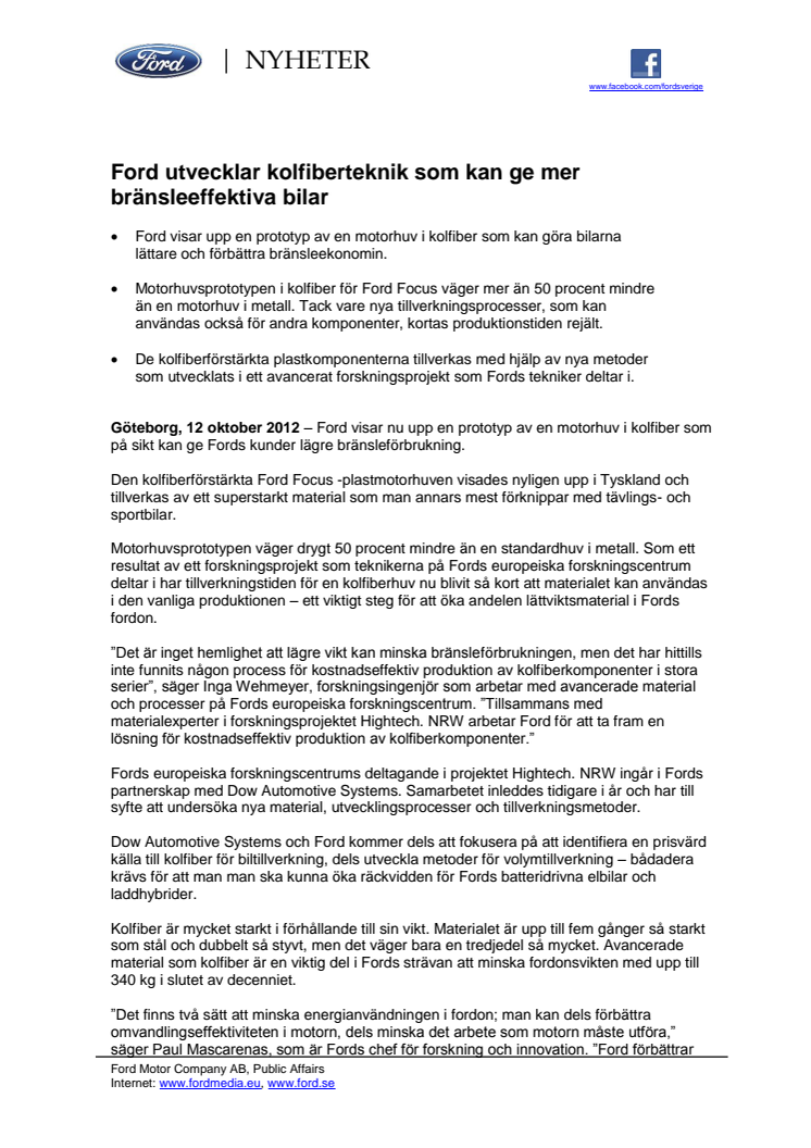 Ford utvecklar kolfiberteknik som kan ge mer bränsleeffektiva bilar