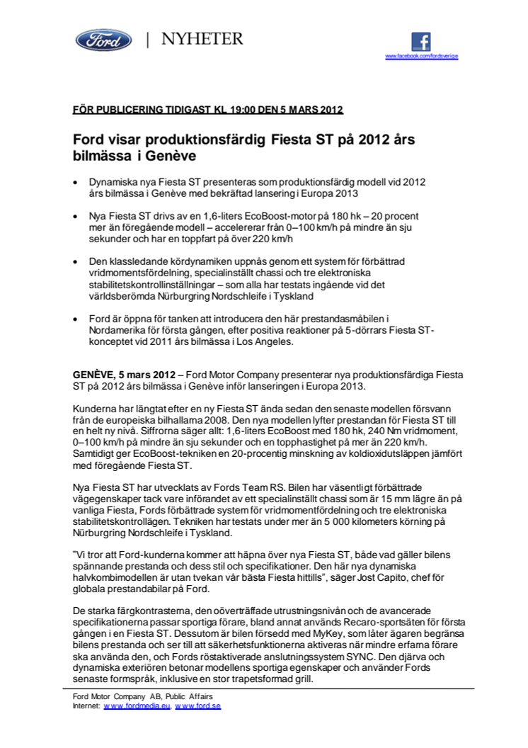 Ford Motor Company presenterar nya produktionsfärdiga Fiesta ST på 2012 års bilmässa i Genève inför lanseringen i Europa 2013.