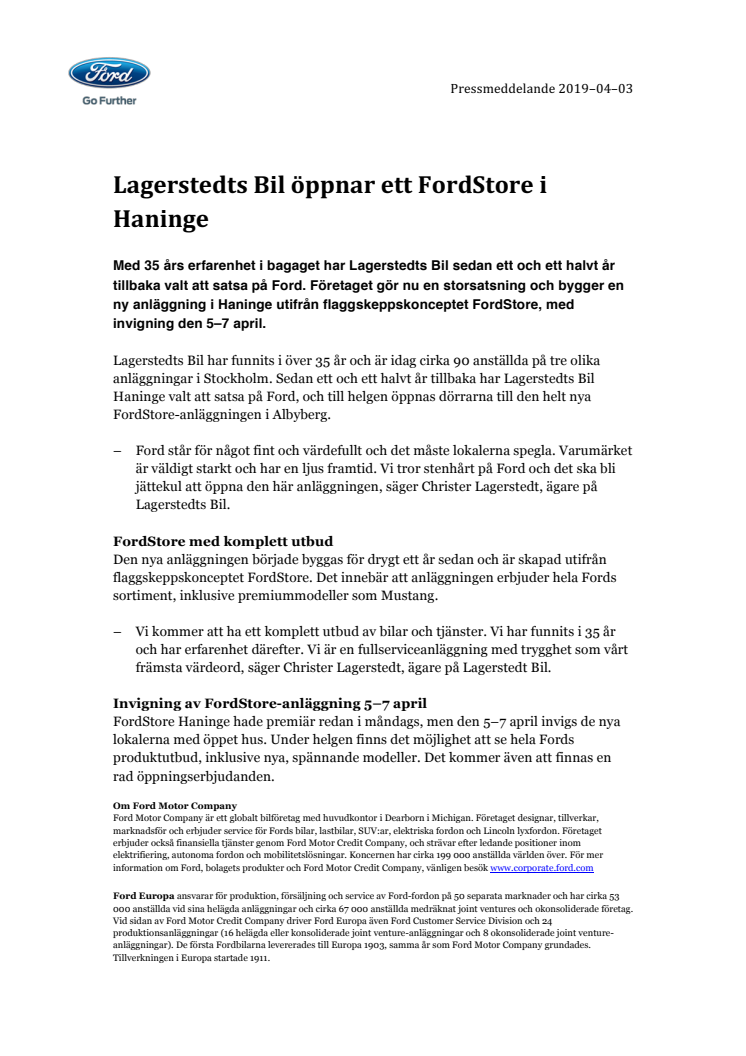 Med 35 års erfarenhet i bagaget har Lagerstedts Bil sedan ett och ett halvt år tillbaka valt att satsa på Ford. Företaget gör nu en storsatsning och bygger en ny anläggning i Haninge utifrån flaggskeppskonceptet FordStore, med invigning den 5–7 april.
