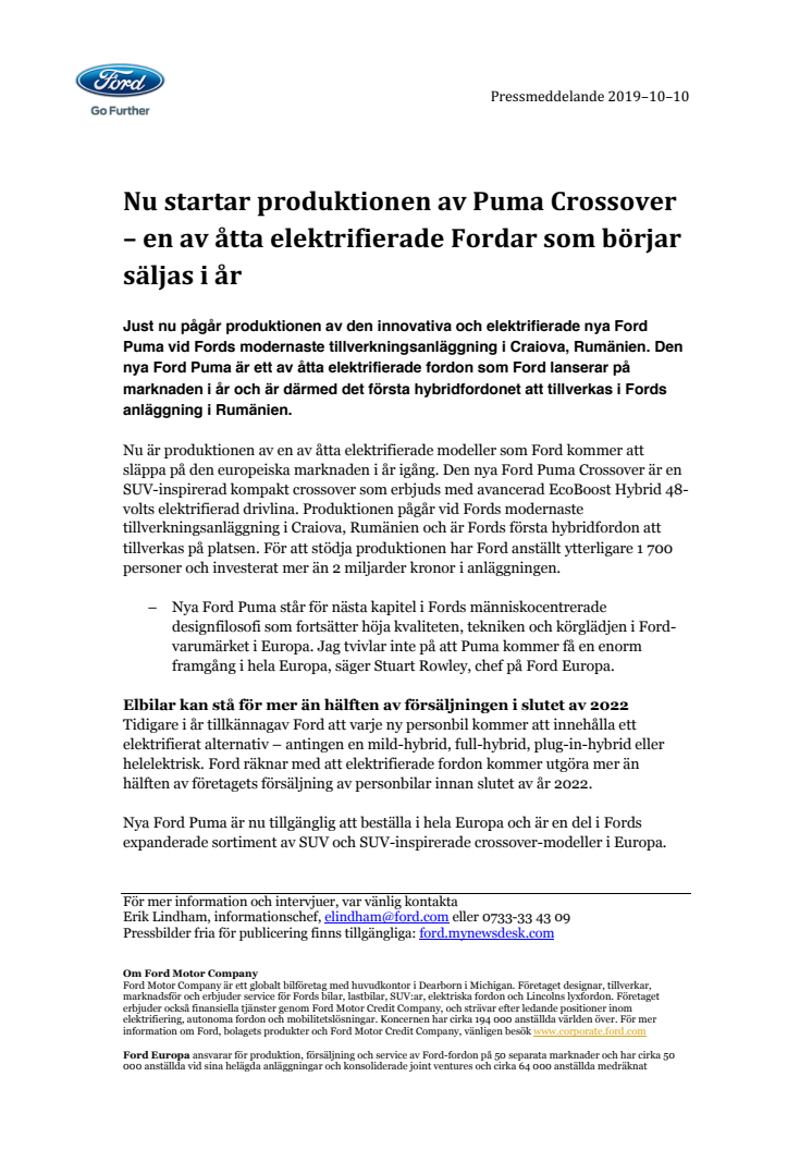 Nu startar produktionen av crossovern Puma – en av åtta elektrifierade Fordar som börjar säljas i år