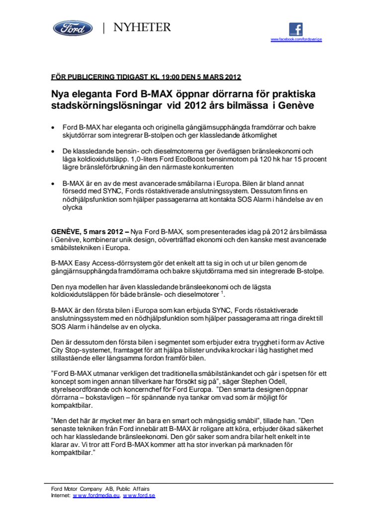 Nya Ford B-MAX, som presenterades idag på 2012 års bilmässa i Genève, kombinerar unik design, oöverträffad ekonomi och den kanske mest avancerade småbilstekniken i Europa.