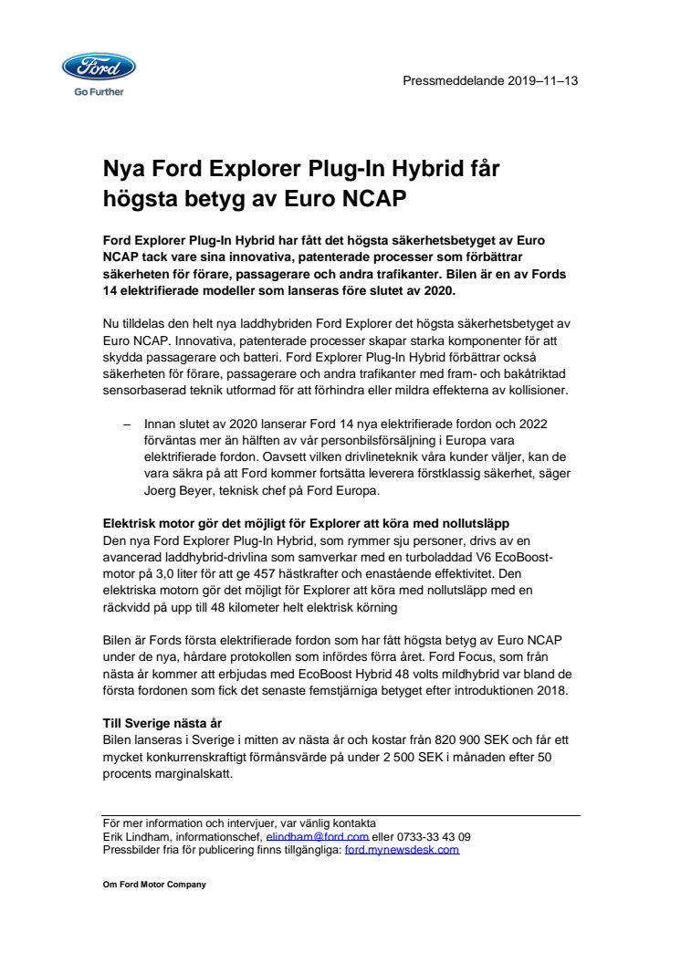 Ford Explorer Plug-In Hybrid har fått det högsta säkerhetsbetyget av Euro NCAP tack vare sina innovativa, patenterade processer som förbättrar säkerheten för förare, passagerare och andra trafikanter. Bilen är en av Fords 14 elektrifierade modeller som lanseras före slutet av 2020.