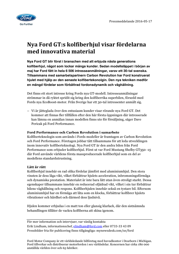 Nya Ford GT blir först i branschen med att erbjuda nästa generations kolfiberhjul, något som lockar många kunder. Sedan modellsläppet i början av maj har Ford fått in hela 6 506 intresseanmälningar, varav ett 30-tal svenska. Tillsammans med samarbetspartnern Carbon Revolution har Ford konstruerat hjulet med hjälp av den senaste kolfibertekonolgin.