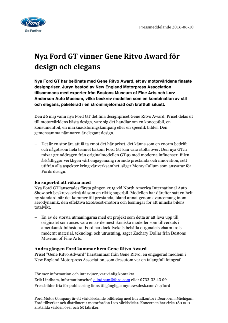 Nya Ford GT har belönats med Gene Ritvo Award, ett av motorvärldens finaste designpriser. Juryn bestod av New England Motorpress Association tillsammans med experter från Bostons Museum of Fine Arts och Larz Anderson Auto Museum, vilka beskrev modellen som en kombination av stil och elegans, paketerad i en strömlinjeformad och kraftfull siluett.
