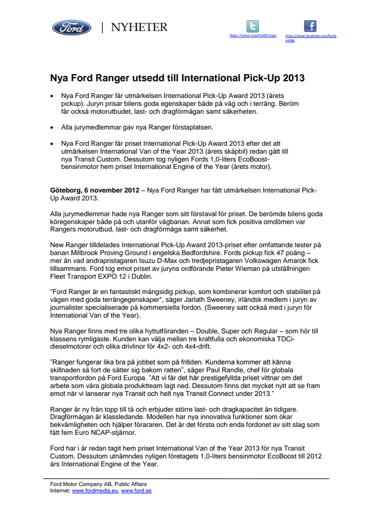 Nya Ford Ranger får utmärkelsen International Pick-Up Award 2013 (årets pickup). Juryn prisar bilens goda egenskaper både på väg och i terräng. Beröm får också motorutbudet, last- och dragförmågan samt säkerheten.