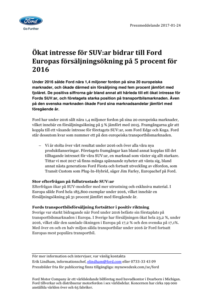 Under 2016 sålde Ford nära 1,4 miljoner fordon på sina 20 europeiska marknader, och ökade därmed sin försäljning med fem procent jämfört med fjolåret. De positiva siffrorna går bland annat att härleda till ett ökat intresse för Fords SUV:ar, och företagets starka position på transportbilsmarknaden. Även på den svenska marknaden ökade Ford sina marknadsandelar jämfört med föregående år.