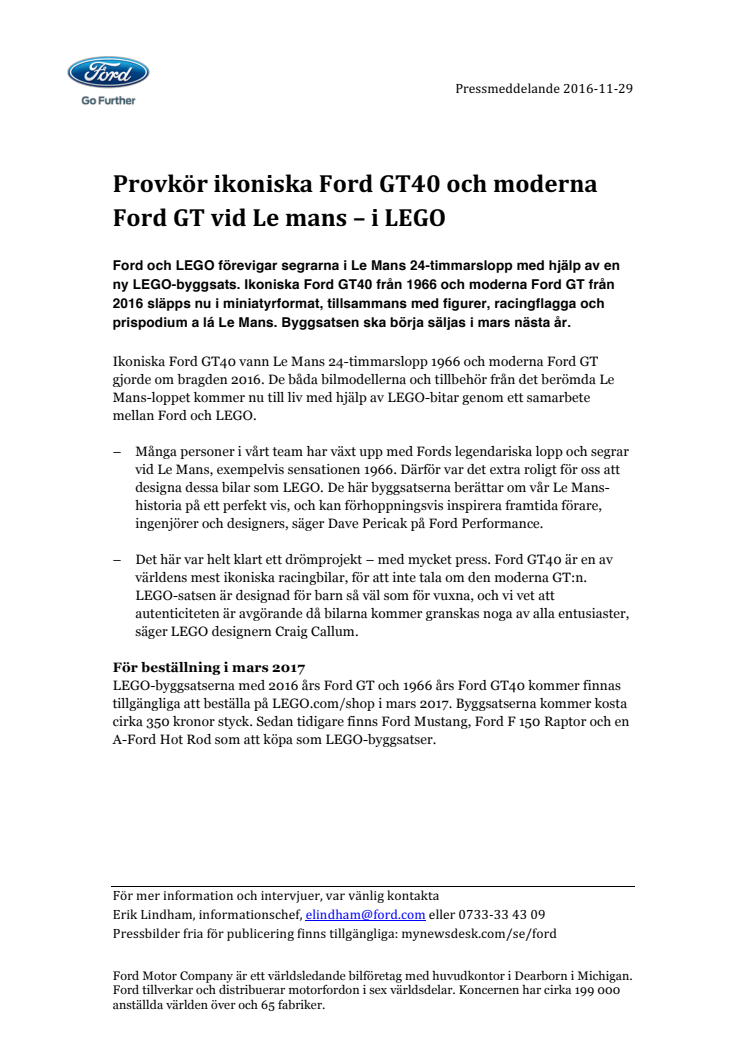 Ford och LEGO förevigar segrarna i Le Mans 24-timmarslopp med hjälp av en ny LEGO-byggsats. Ikoniska Ford GT40 från 1966 och moderna Ford GT från 2016 släpps nu i miniatyrformat, tillsammans med figurer, racingflagga och prispodium a lá Le Mans. Byggsatsen ska börja säljas i mars nästa år.