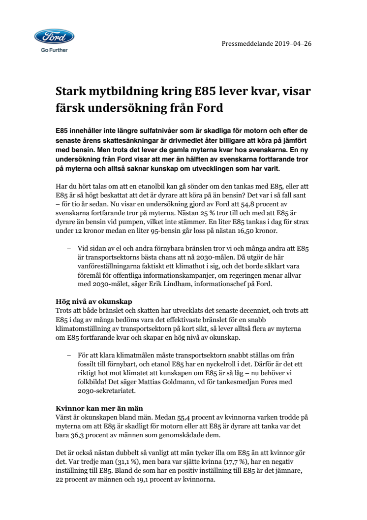 E85 innehåller inte längre sulfatnivåer som är skadliga för motorn och efter de senaste årens skattesänkningar är drivmedlet åter billigare att köra på jämfört med bensin. Men trots det lever de gamla myterna kvar hos svenskarna. En ny undersökning från Ford visar att mer än hälften av svenskarna fortfarande tror på myterna och alltså saknar kunskap om utvecklingen som har varit.