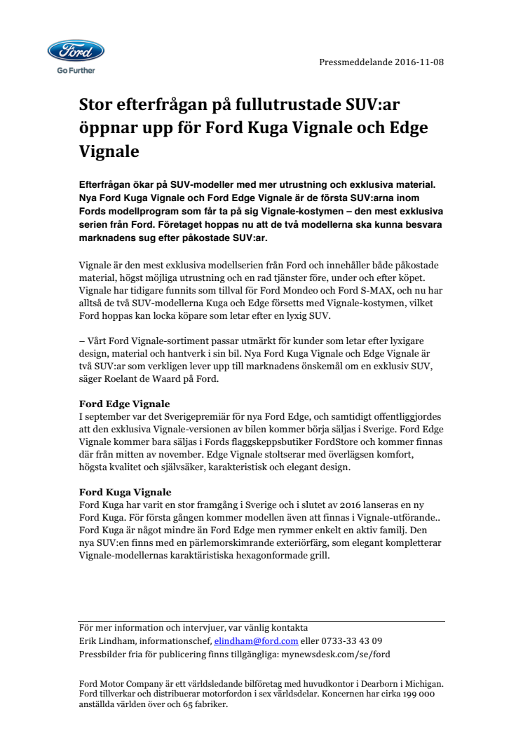 Efterfrågan ökar på SUV-modeller med mer utrustning och exklusiva material. Nya Ford Kuga Vignale och Ford Edge Vignale är de första SUV:arna inom Fords modellprogram som får ta på sig Vignale-kostymen – den mest exklusiva serien från Ford. Företaget hoppas nu att de två modellerna ska kunna besvara marknadens sug efter påkostade SUV:ar.