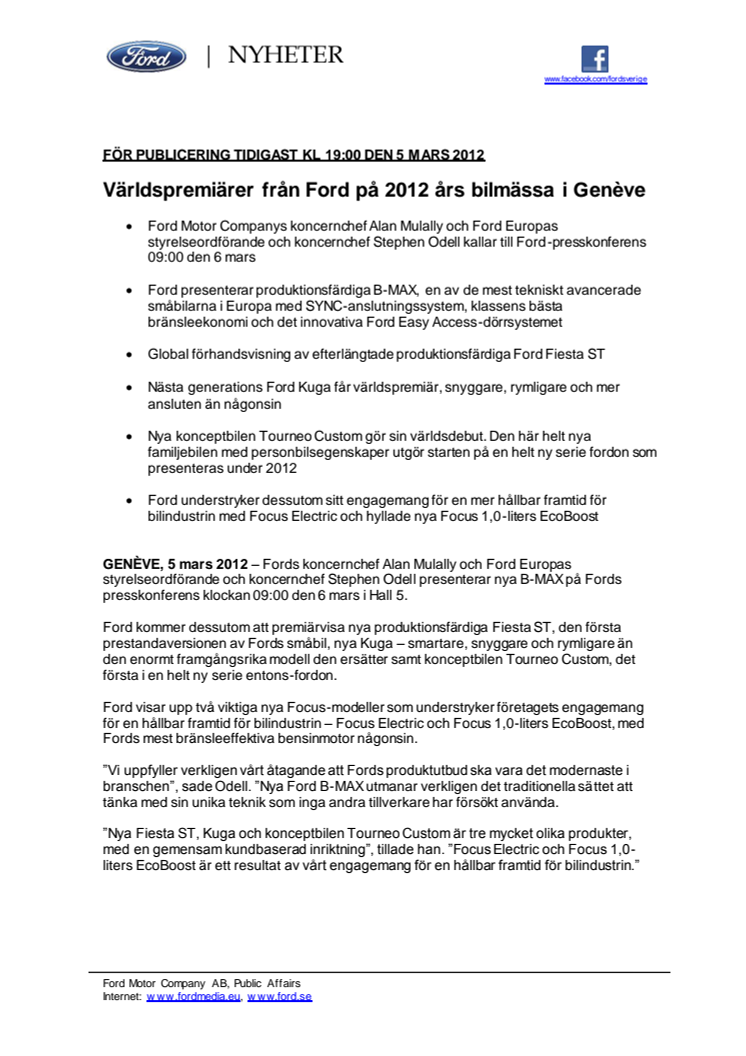 Fords koncernchef Alan Mulally och Ford Europas styrelseordförande och koncernchef Stephen Odell presenterar nya B-MAX på Fords presskonferens den 6 mars. Dessutom premiärvisas nya produktionsfärdiga Fiesta ST, nya Kuga – smartare, snyggare och rymligare än den enormt framgångsrika modell den ersätter samt konceptbilen Tourneo Custom, det första i en helt ny serie entons-fordon.
