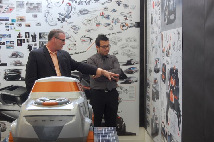 Pat Schiavone, designchef för Ford pickups och lastbilar diskuterar Filip Bosevskis T-Fords concept. Filip är designstudent på College for Creative Studies i Detroit, USA.