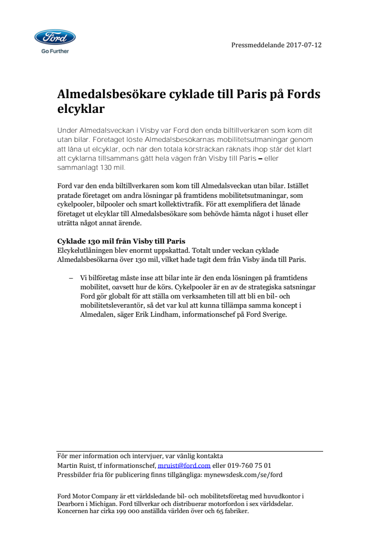 Under Almedalsveckan i Visby var Ford den enda biltillverkaren som kom dit utan bilar. Företaget löste Almedalsbesökarnas mobilitetsutmaningar genom att låna ut elcyklar, och när den totala körsträckan räknats ihop står det klart att cyklarna tillsammans gått hela vägen från Visby till Paris – eller sammanlagt 130 mil.