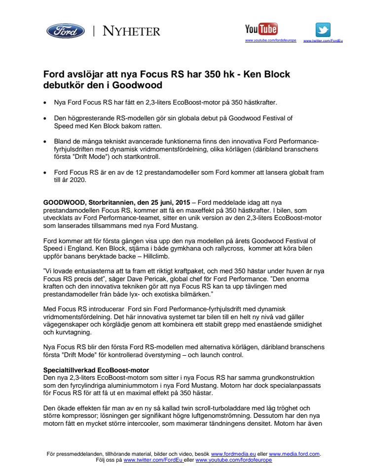 Goodwood, Storbritannien, den 25 juni, 2015 – Ford meddelade idag att nya prestandamodellen Focus RS, kommer att få en maxeffekt på 350 hästkrafter. I bilen, som utvecklats av Ford Performance-teamet, sitter en unik version av den 2,3-liters EcoBoost-motor som lanserades tillsammans med nya Ford Mustang.