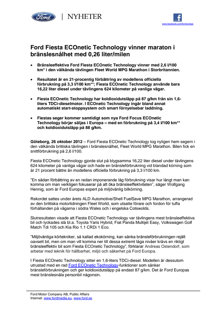 Göteborg, 26 oktober 2012 – Ford Fiesta ECOnetic Technology tog nyligen hem segern i den välkända brittiska tävlingen i bränslesnålhet, Fleet World MPG Marathon. Bilen fick en snittförbrukning på 2,6 l/100.