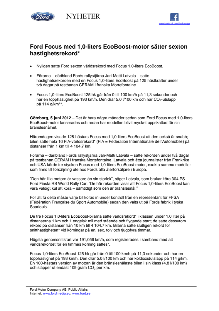- Förarna – däribland Fords rallystjärna Jari-Matti Latvala – satte hastighetsrekorden med en Focus 1,0-liters EcoBoost på 125 hästkrafter under två dagar på testbanan CERAM i franska Mortefontaine.