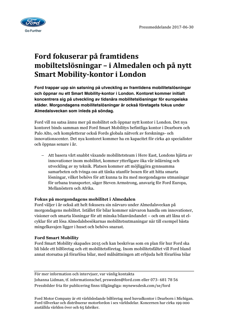 Ford trappar upp sin satsning på utveckling av framtidens mobilitetslösningar och öppnar nu ett Smart Mobility-kontor i London. Kontoret kommer initialt koncentrera sig på utveckling av tidsnära mobilitetslösningar för europeiska städer. Morgondagens mobilitetslösningar är också företagets fokus under Almedalsveckan som inleds på söndag.