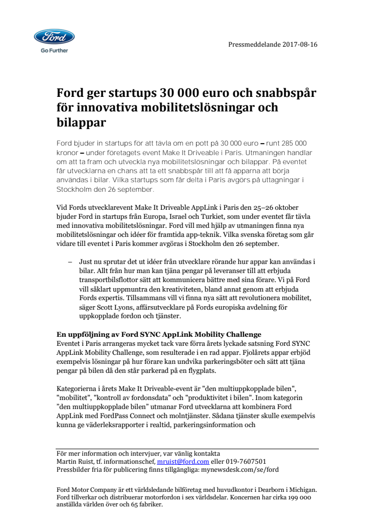Vid Fords utvecklarevent Make It Driveable AppLink i Paris den 25–26 oktober bjuder Ford in startups från Europa, Israel och Turkiet, som under eventet får tävla med innovativa mobilitetslösningar. Ford vill med hjälp av utmaningen finna nya mobilitetslösningar och idéer för framtida app-teknik. Vilka svenska företag som går vidare till eventet i Paris kommer avgöras i Stockholm den 26 september.