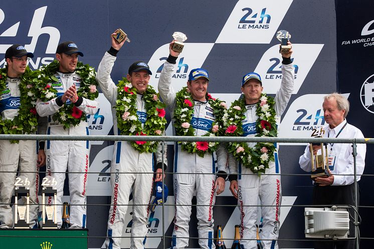 Fords racingteam Ford Chip Ganassi Racing lyckades med den sagolika bragden att vinna Le Mans 24-timmarslopp på söndagseftermiddagen. Bakom ratten på vinnarbilen Ford GT med nummer 68 satt Sébastien Bourdais (Frankrike), Joey Hand (USA) och Dirk Müller (Tyskland). Även bronsplatsen i tävlingen var en Ford GT, nummer 69 med förarna Ryan Briscoe (Australien), Scott Dixon (Nya Zeeland) och Richard Westbrook (Storbritannien).