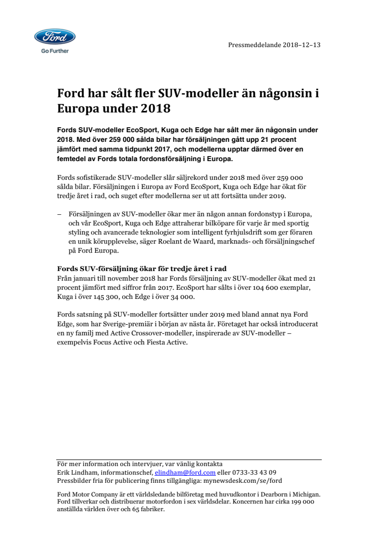 Fords SUV-modeller EcoSport, Kuga och Edge har sålt mer än någonsin under 2018. Med över 259 000 sålda bilar har försäljningen gått upp 21 procent jämfört med samma tidpunkt 2017, och modellerna upptar därmed över en femtedel av Fords totala fordonsförsäljning i Europa.