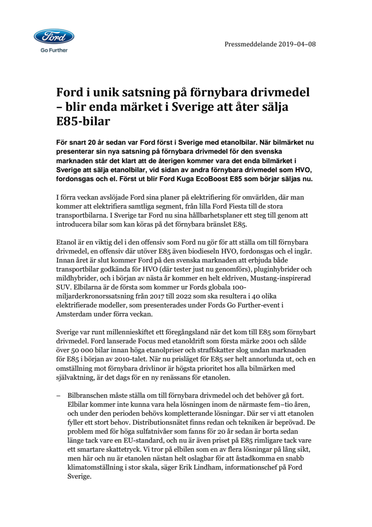 Etanol är en viktig del i den offensiv som Ford nu gör för att ställa om till förnybara drivmedel, en offensiv där utöver E85 även biodieseln HVO, fordonsgas och el ingår. Innan året är slut kommer Ford på den svenska marknaden att erbjuda både transportbilar godkända för HVO (där tester just nu genomförs), pluginhybrider och mildhybrider, och i början av nästa år kommer en helt eldriven, Mustang-inspirerad SUV. Elbilarna är de första som kommer ur Fords globala 100-miljarderkronorssatsning från 2017 till 2022 som ska resultera i 40 olika elektrifierade modeller, som presenterades under Fords Go Further-event i Amsterdam under förra veckan.