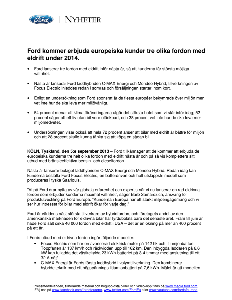 Nästa år lanserar bolaget laddhybriden C-MAX Energi och Mondeo Hybrid. Redan idag kan kunderna beställa Ford Focus Electric, en batterdriven och helt utsläppsfri modell som produceras i tyska Saarlouis.