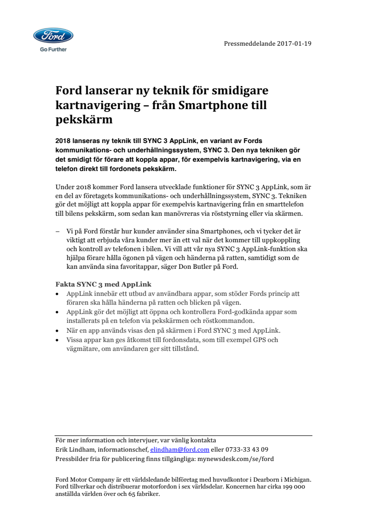 – Vi på Ford förstår hur kunder använder sina Smartphones, och vi tycker det är viktigt att erbjuda våra kunder mer än ett val när det kommer till uppkoppling och kontroll av telefonen i bilen. Vi vill att vår nya SYNC 3 AppLink-funktion ska hjälpa förare hålla ögonen på vägen och händerna på ratten, samtidigt som de kan använda sina favoritappar, säger Don Butler på Ford.