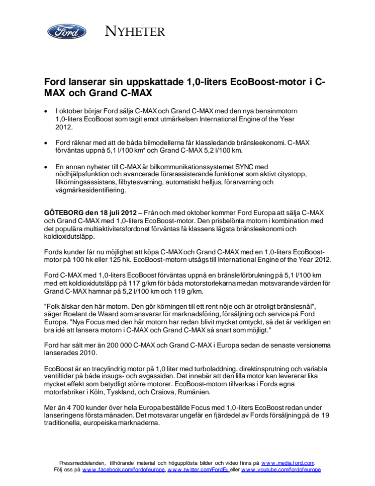 Göteborg den 18 juli 2012 – Från och med oktober kommer Ford Europa att sälja C-MAX och Grand C-MAX med 1,0-liters EcoBoost-motor. Den prisbelönta motorn i kombination med det populära multiaktivitetsfordonet förväntas få klassens lägsta bränsleekonomi och koldioxidutsläpp.