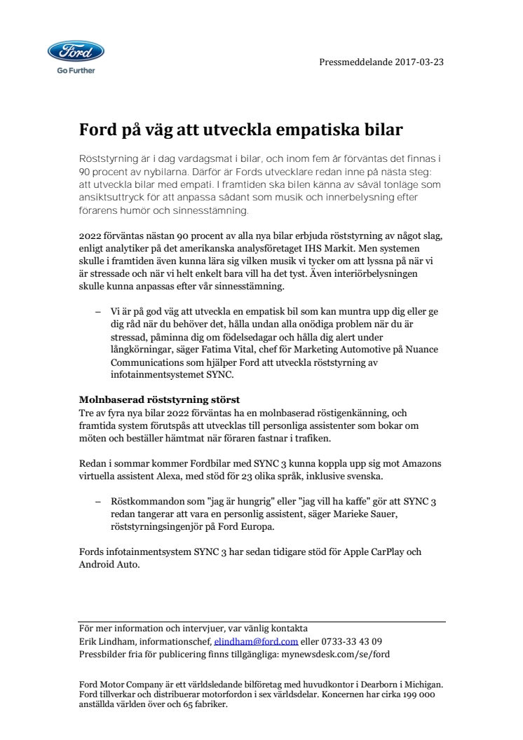 Röststyrning är i dag vardagsmat i bilar, och inom fem år förväntas det finnas i 90 procent av nybilarna. Därför är Fords utvecklare redan inne på nästa steg: att utveckla bilar med empati. I framtiden ska bilen känna av såväl tonläge som ansiktsuttryck för att anpassa sådant som musik och innerbelysning efter förarens humör och sinnesstämning.