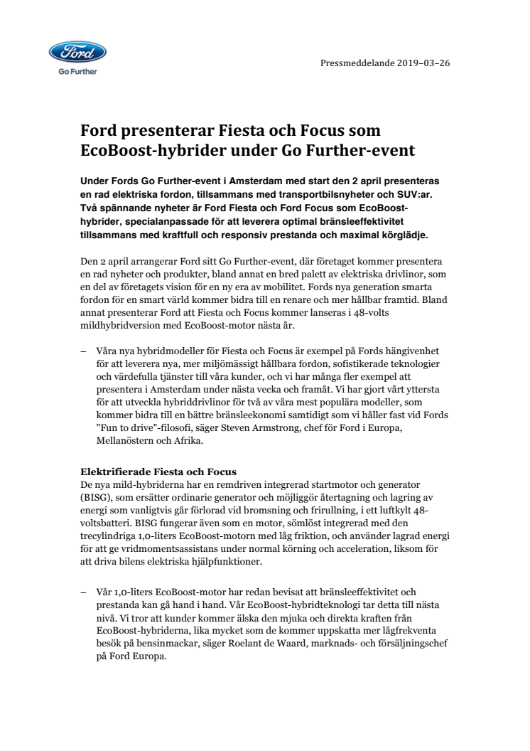 Den 2 april arrangerar Ford sitt Go Further-event, där företaget kommer presentera en rad nyheter och produkter, bland annat en bred palett av elektriska drivlinor, som en del av företagets vision för en ny era av mobilitet. Fords nya generation smarta fordon för en smart värld kommer bidra till en renare och mer hållbar framtid. Bland annat presenterar Ford att Fiesta och Focus kommer lanseras i 48-volts mildhybridversion med EcoBoost-motor nästa år.