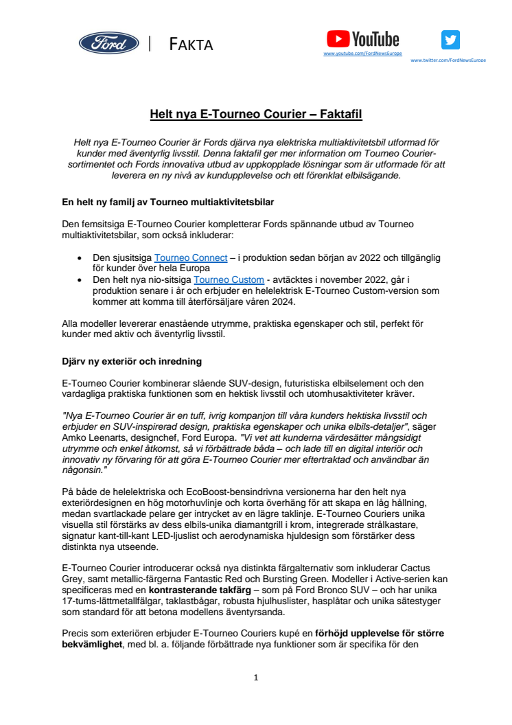 "Spännande nya produkter som E-Tourneo Courier är Fords framtid i Europa – elektriska, roliga och drivna av ett rastlöst sökande efter nästa äventyr. Vår nya helelektriska multiaktivitetsbil är det senaste exemplet på vår globala miljard-satsning för att skala upp elbilsproduktionen och leverera fler uppkopplade ”vill-ha” produkter till våra kunder”, säger Martin Sander, general manager, Ford Model e, Europa.