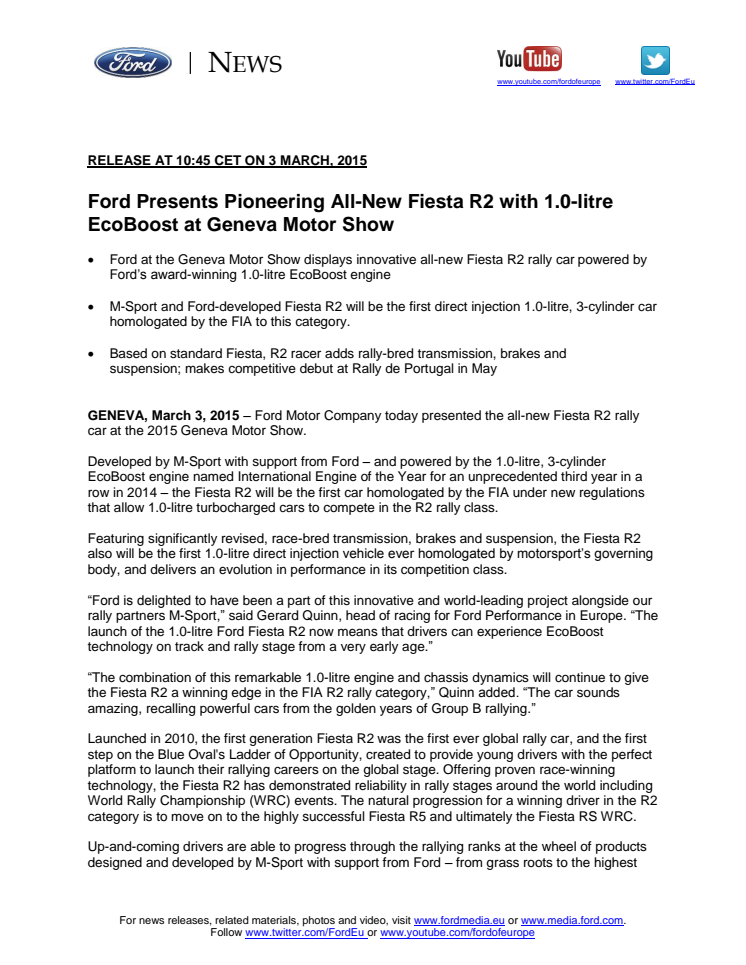 - Ford at the Geneva Motor Show displays innovative all-new Fiesta R2 rally carpowered by Ford’s award-winning 1.0-litre EcoBoost engine