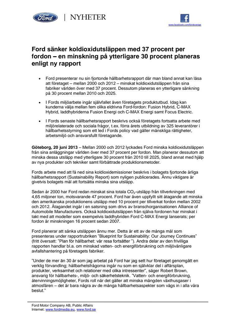 - Ford presenterar nu sin fjortonde hållbarhetsrapport där man bland annat kan läsa att företaget – mellan 2000 och 2012 – minskat koldioxidutsläppen från sina fabriker världen över med 37 procent. Dessutom planeras en ytterligare sänkning på 30 procent mellan 2010 och 2025.