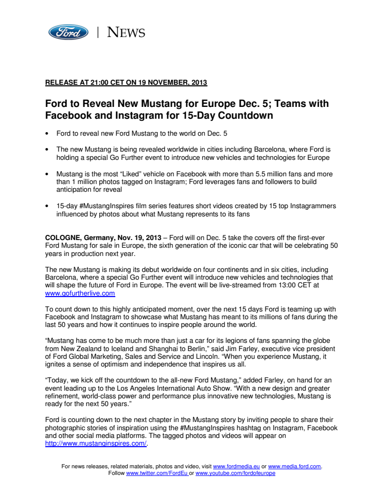 Ford to Reveal New Mustang for Europe Dec. 5; Teams with Facebook and Instagram for 15-Day Countdown