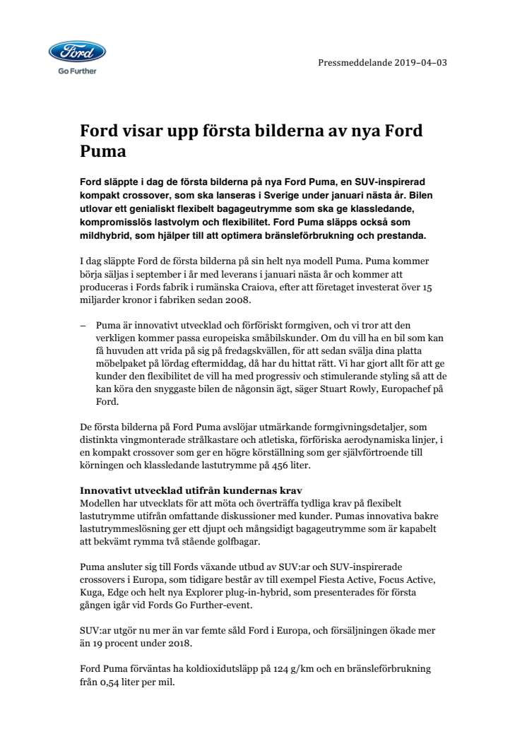 – Puma är innovativt utvecklad och förföriskt formgiven, och vi tror att den verkligen kommer passa europeiska småbilskunder. Om du vill ha en bil som kan få huvuden att vrida på sig på fredagskvällen, för att sedan svälja dina platta möbelpaket på lördag eftermiddag, då har du hittat rätt. Vi har gjort allt för att ge kunder den flexibilitet de vill ha med progressiv och stimulerande styling så att de kan köra den snyggaste bilen de någonsin ägt, säger Stuart Rowly, Europachef på Ford.
