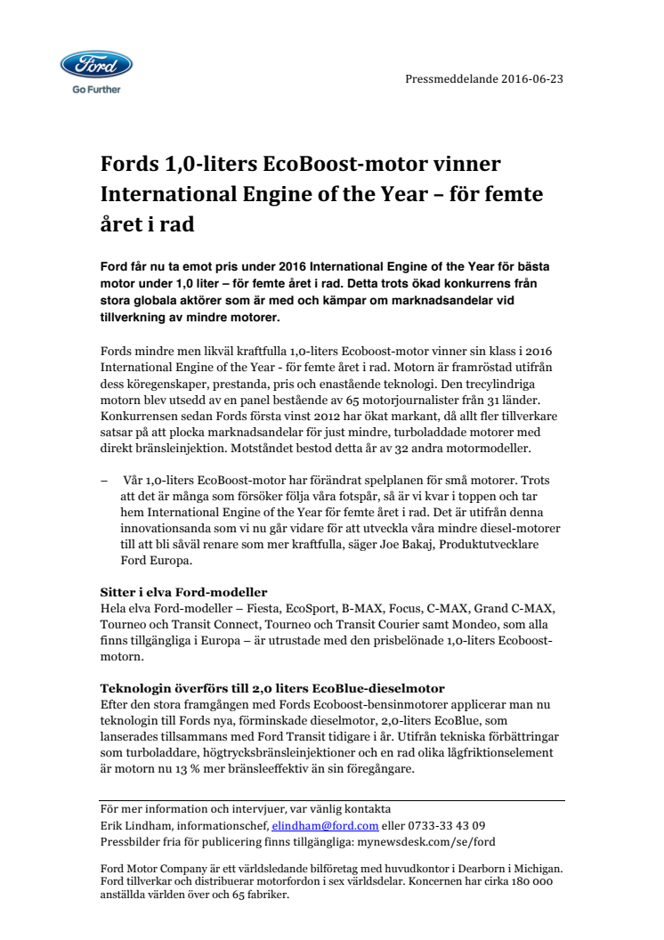Fords mindre men likväl kraftfulla 1,0-liters Ecoboost-motor vinner sin klass i 2016 International Engine of the Year - för femte året i rad. Motorn är framröstad utifrån dess köregenskaper, prestanda, pris och enastående teknologi. Den trecylindriga motorn blev utsedd av en panel bestående av 65 motorjournalister från 31 länder. Konkurrensen sedan Fords första vinst 2012 har ökat markant, då allt fler tillverkare satsar på att plocka marknadsandelar för just mindre, turboladdade motorer med direkt bränsleinjektion. Motståndet bestod detta år av 32 andra motormodeller.