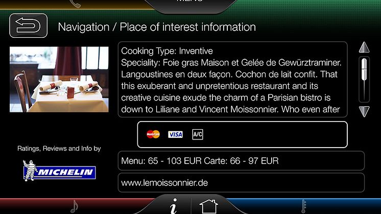 Hela Guide MICHELIN kommer att vara tillgänglig via SYNC med MyFord Touch. Oavsett om man letar efter ett litet hotell på landsbygden eller en exklusiv gourmetrestaurang har Michelins inspektörer valt ut de bästa alternativen.