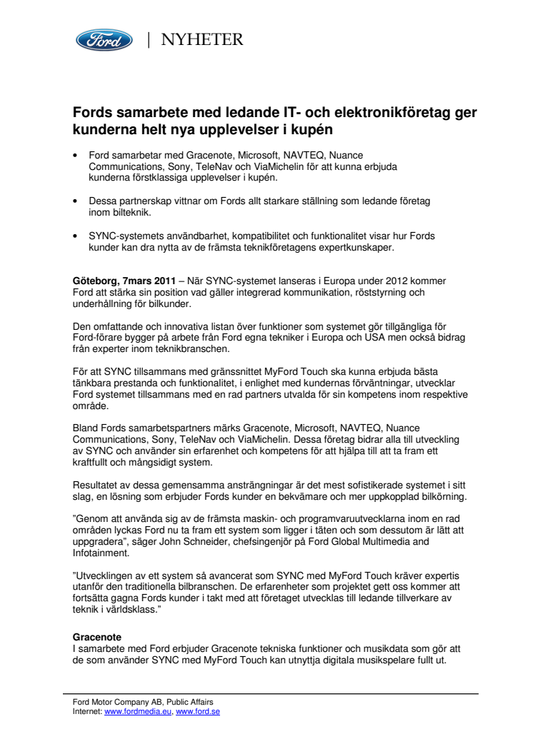 - Ford samarbetar med Gracenote, Microsoft, NAVTEQ, Nuance Communications, Sony, TeleNav och ViaMichelin för att kunna erbjuda kunderna förstklassiga upplevelser i kupén.