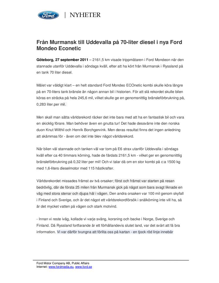 Göteborg, 27 september 2011 – 2161,5 km visade trippmätaren i Ford Mondeon när den stannade utanför Uddevalla i söndags kväll, efter att ha kört från Murmansk i Ryssland på en tank 70 liter diesel.