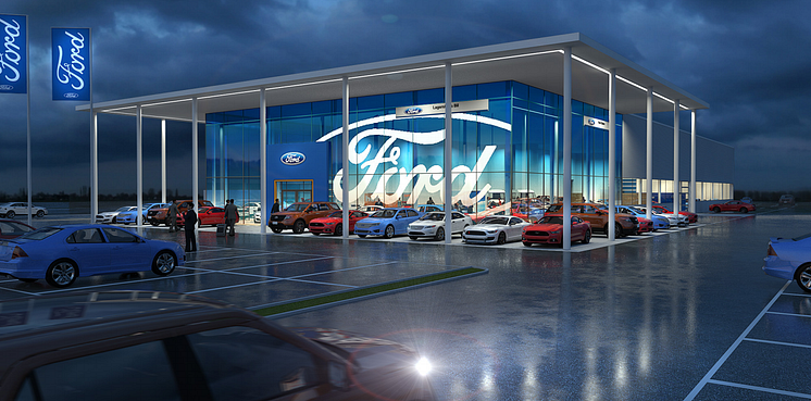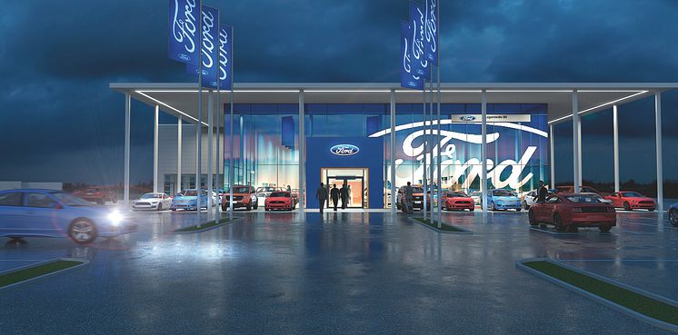 Den nya anläggningen började byggas för drygt ett år sedan och är skapad utifrån flaggskeppskonceptet FordStore. Det innebär att anläggningen erbjuder hela Fords sortiment, inklusive premiummodeller som Mustang.