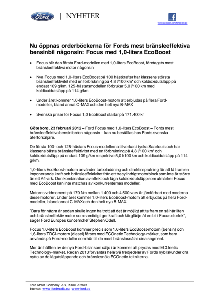 Göteborg, 23 februari 2012 – Ford Focus med 1,0-liters EcoBoost – Fords mest bränsleeffektiva bensinfordon någonsin – kan nu beställas hos Fords svenska återförsäljare.