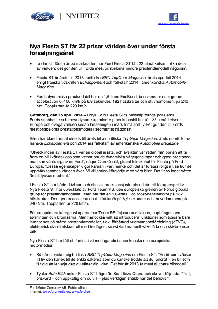”Utvecklingen av Fiesta ST var en global insats, och avsikten var redan från början att ta fram en bil i världsklass som vittnar om de dynamiska vägegenskaper och goda prestanda man kan vänta sig av en Ford”, säger Glen Goold, global teknikchef för Fiesta på Ford Europa. "Dessa egenskaper utgör kärnan i vårt märke och det är förstås roligt att se hur de uppmärksammas världen över. Vi vill sprida körglädje med våra bilar. Det finns inget bättre än att lyckas med det.”